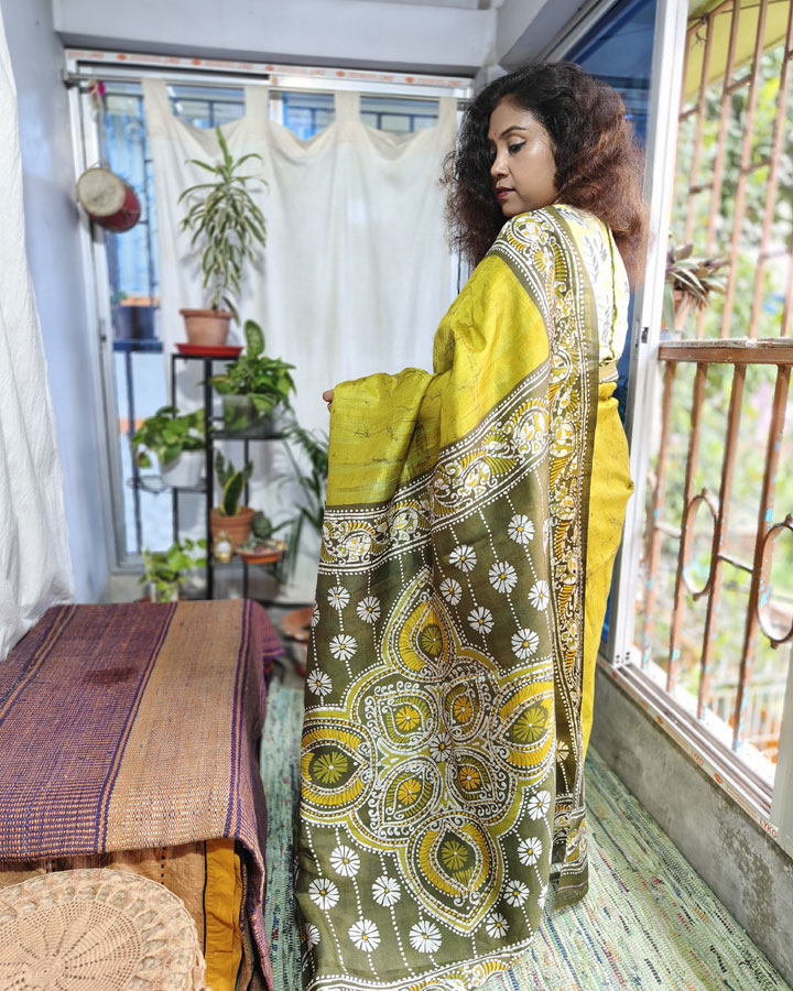 Luxurious, lightweight, and effortlessly elegant, this Hand Batik Bishnupuri Silk saree showcases the finesse of traditional craftsmanship. The off-white base is adorned with intricate crack batik detailing, enhanced by exquisite hand-painted Alpana designs. The striking contrast of lemon yellow and shades of green adds vibrancy, highlighting the rich cultural heritage of Bengal. Known for its soft texture and graceful drape, Bishnupuri Silk elevates this saree into a timeless piece of wearable art.