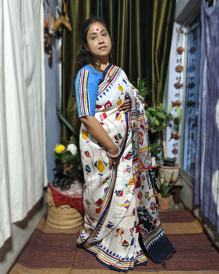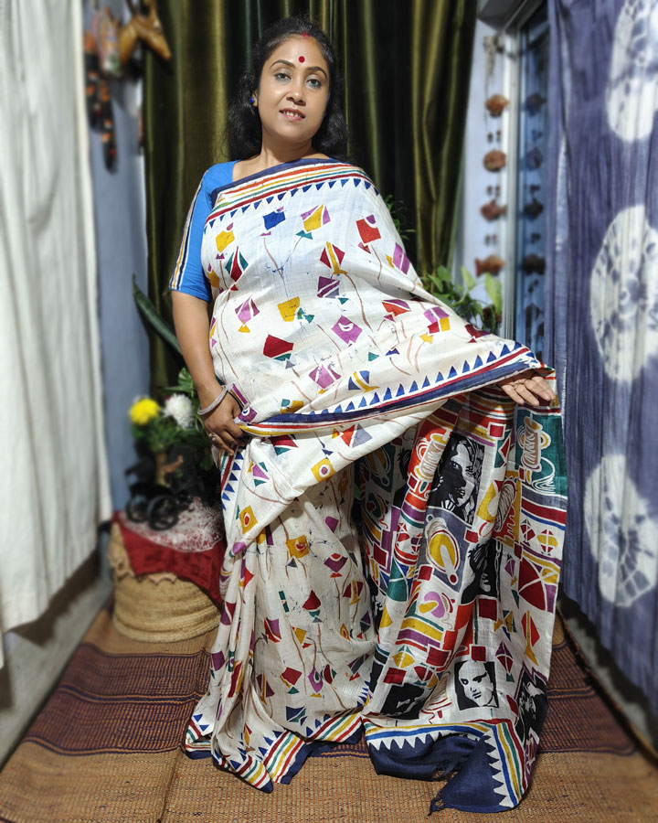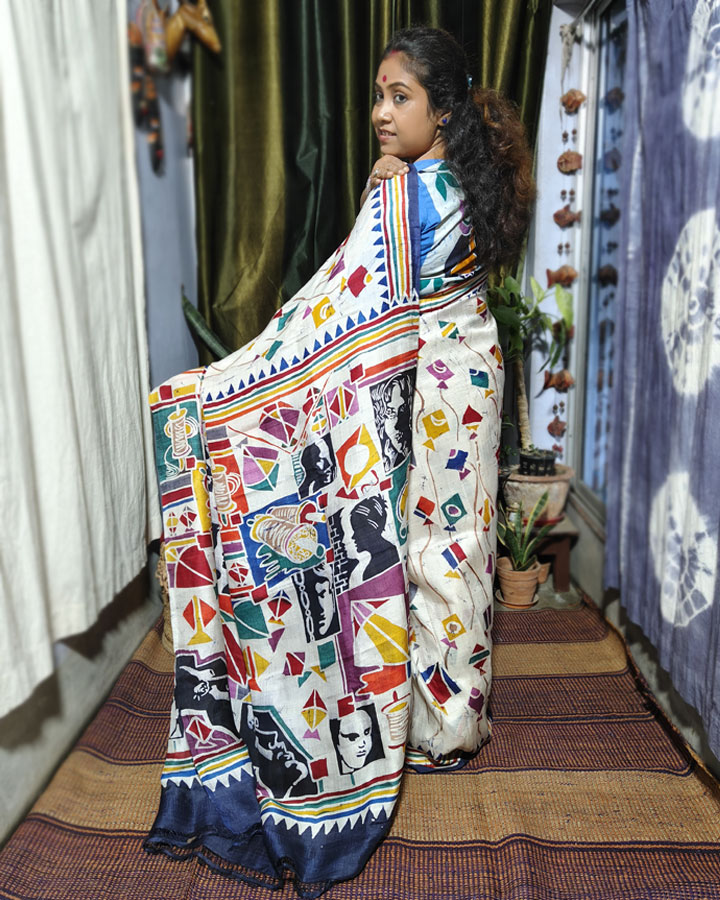 Luxurious, lightweight, and effortlessly elegant, this Hand Batik Bishnupuri Silk saree reflects the quiet grace of modern batik artistry. Flying kites in the white base takes us in the childhood days. Blunt black faces tell us that childhood days are rapidly fading in the jungle of concrete.