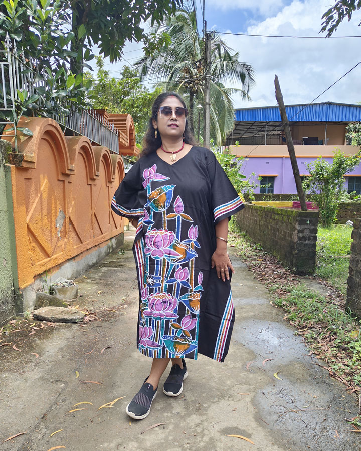 On a deep black base, this kaftan is brought to life with hand-painted lotus motifs in shades of pink, complemented by green, blue, and yellow leaves and seedpods. A striped border in matching tones runs along both sides, enhancing its elegant contrast.