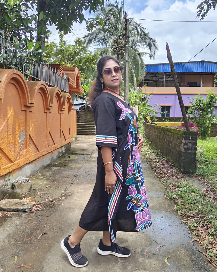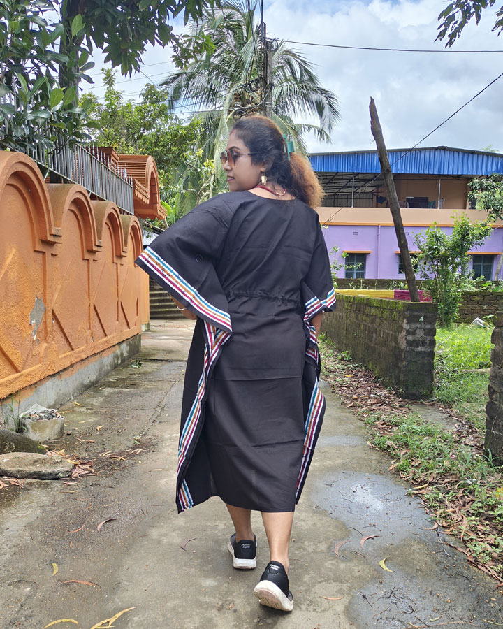Crafted from breathable pure cotton, it ensures effortless comfort and versatility. Designed to be worn as a flowing kaftan dress or paired with leggings for a chic kurti look, this piece embodies timeless sophistication with a handcrafted touch.