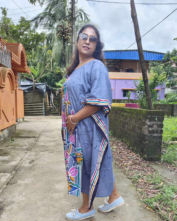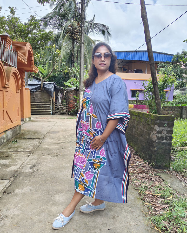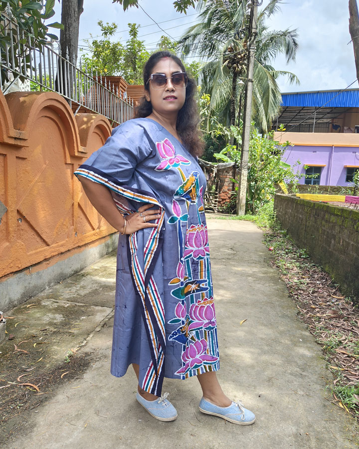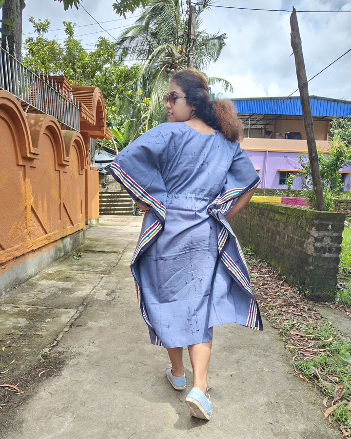 Made from breathable pure cotton, it offers lightweight comfort and ease, perfect for all-day wear across seasons. The versatile silhouette allows it to be styled as a flowing kaftan dress or paired with leggings for a chic kaftan kurti look. Blending traditional hand batik artistry with everyday functionality, this piece is a graceful addition to any wardrobe.