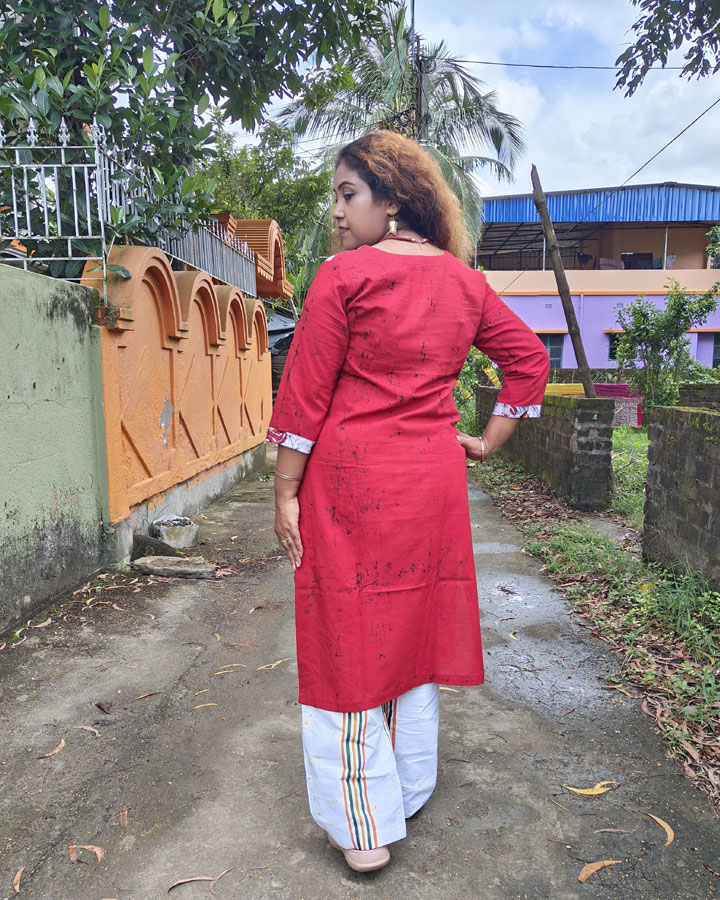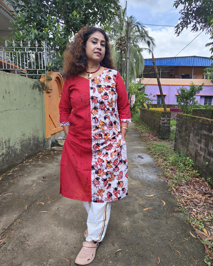A vibrant ode to heritage artistry, this pure cotton kurti features a radiant red base with a striking half-and-half design. One side is kept solid red, while the other showcases hand batik motifs of Palash flowers (Flame of the Forest) on a crisp white backdrop. The contrasting halves create a bold yet graceful balance—where traditional batik meets contemporary styling.
