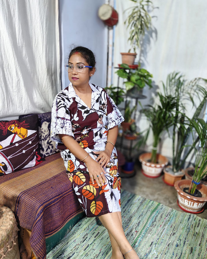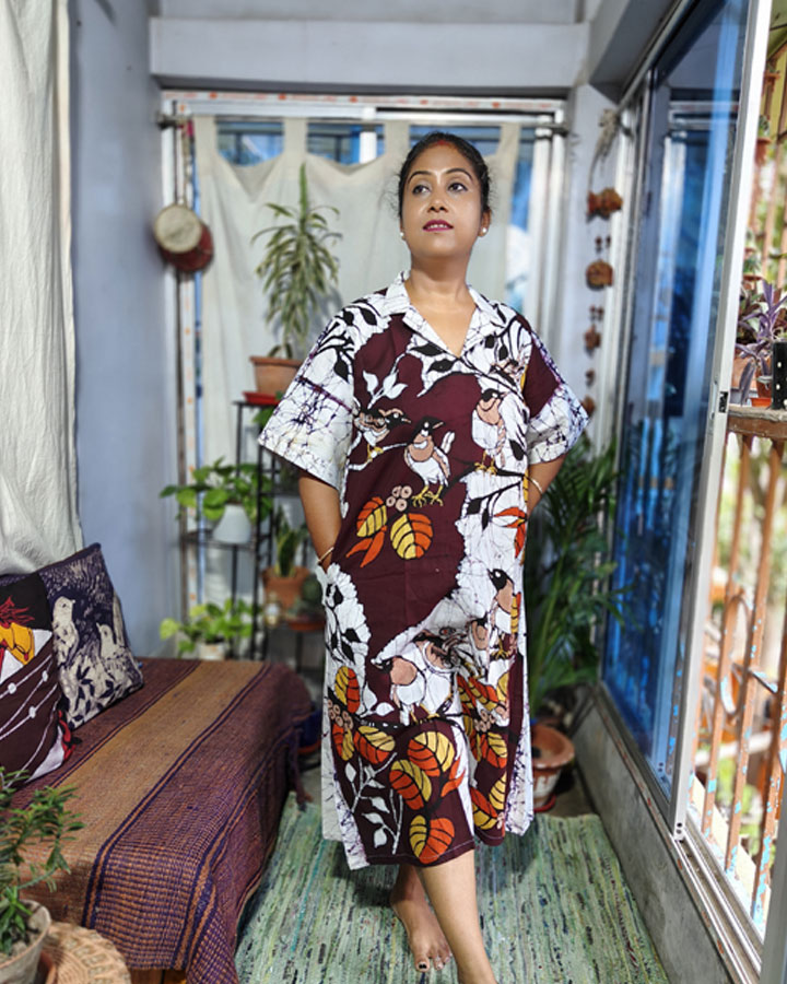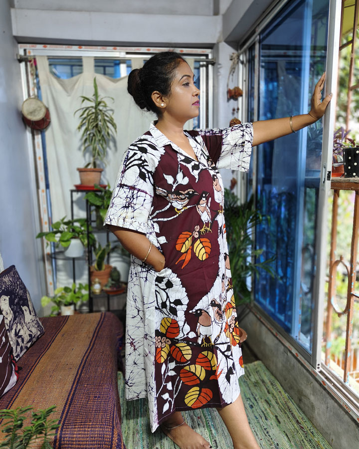 Bold, artistic, and steeped in elegance—this pure cotton anti-fit one-piece dress features Srizanexclusive’s signature hand batik craftsmanship with an eye-catching composition of doel birds perched on leafy branches. The crisp white base is layered with bold black all-over crack batik, while deep maroon patches create striking backdrops for the intricate bird motifs. Painted in a warm palette of black, light brown, orange, and yellow—with thoughtful outlines that sometimes let the white base play into the design—every detail speaks of meticulous artistry.