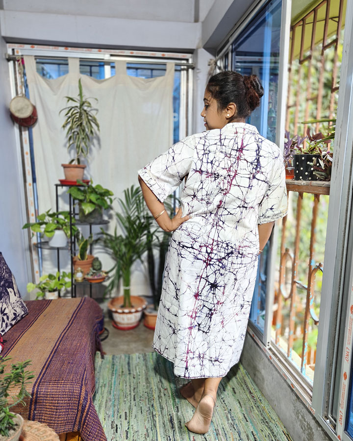 The dress is tailored for comfort with its relaxed anti-fit silhouette, short loose sleeves, a smart collared neck, and a practical side pocket. A stylish fusion of tradition and modern flair, perfect for adding an artistic edge to any occasion of your choice.