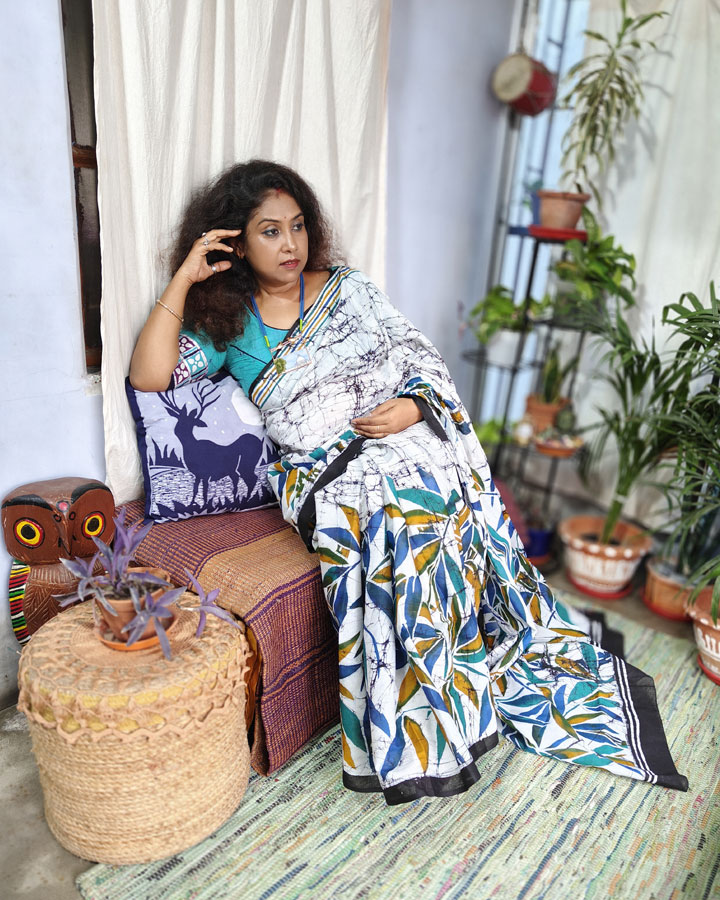 Crafted on a soft white pure cotton base, this saree features an all-over black crack batik that sets the stage for graceful bamboo (karmuk) motifs hand-painted in soothing shades of blue, green, and mustard yellow across the lower half and pallu. The borders are thoughtfully designed—striped in matching hues on one side and paired with a balanced black border on the other, adding symmetry and charm.