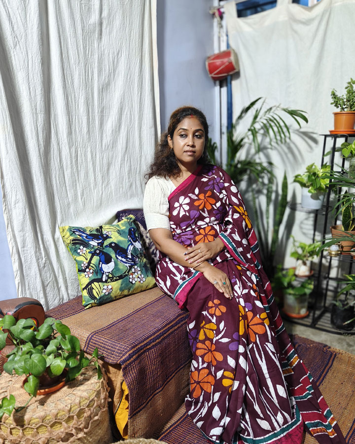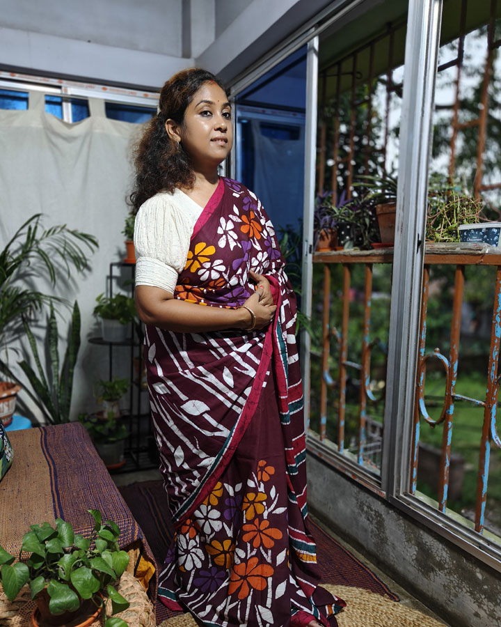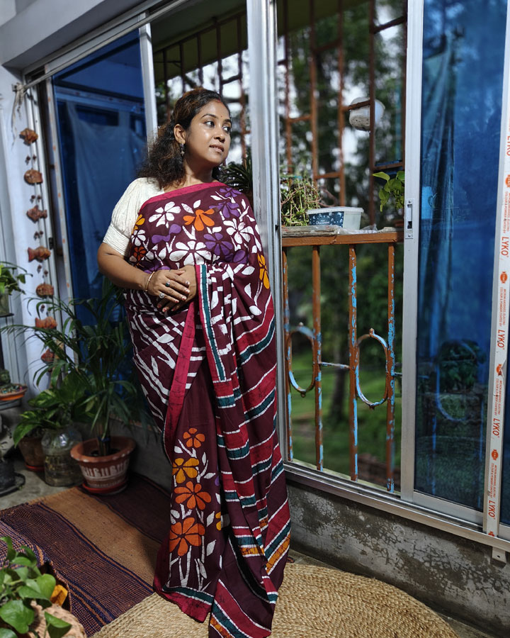Vibrant and full of festive charm, this hand batik pure cotton saree features floral motifs of Nayantara flowers gracefully painted on a deep maroon base. The flowers bloom in radiant shades of white, orange, yellow, and purple—each rendered with meticulous hand wax batik craftsmanship. Subtle crack batik detailing runs throughout the body, adding layers of depth and texture.
