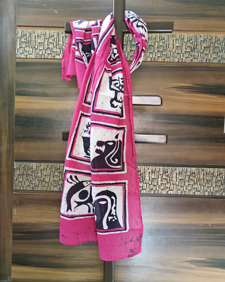 This handcrafted pure cotton scarf (1.85 meters by 21 inches) brings together bold design and celestial charm. Painted using traditional hand wax batik, it features an array of black zodiac symbols nestled in white square blocks, set against a lively rani pink base with subtle crack detailing. A visually rich and spiritually inspired accessory, it can be styled as a scarf, stole, or one-sided dupatta. Chic yet grounded, and effortlessly comfortable for all-day wear.