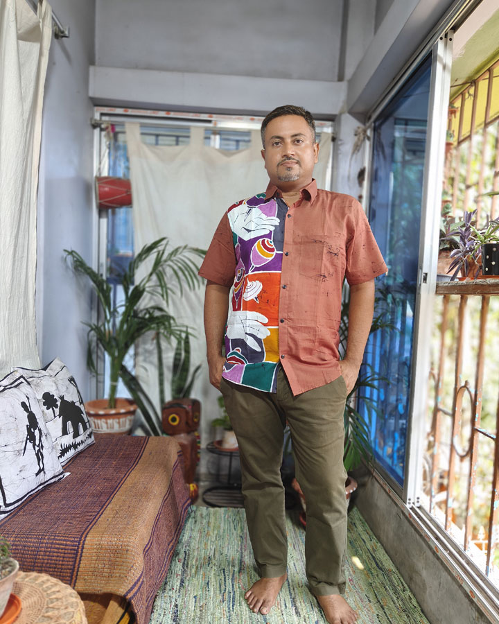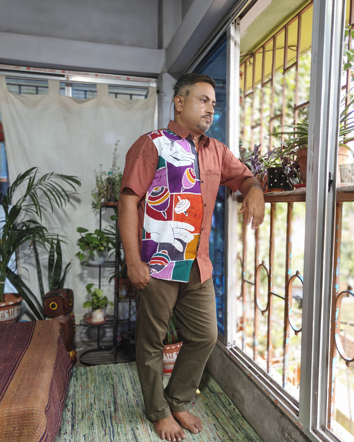Rendered in rich, bold color tones, the design is carefully composed with artistic breaks and dynamic placements that give it a unique visual rhythm. Crafted on soft, breathable pure cotton, it’s a piece that stands out with comfort and character. Perfect for casual outings or cultural gatherings, this shirt celebrates traditional craft in a modern, wearable form—an ode to heritage spun into everyday style.